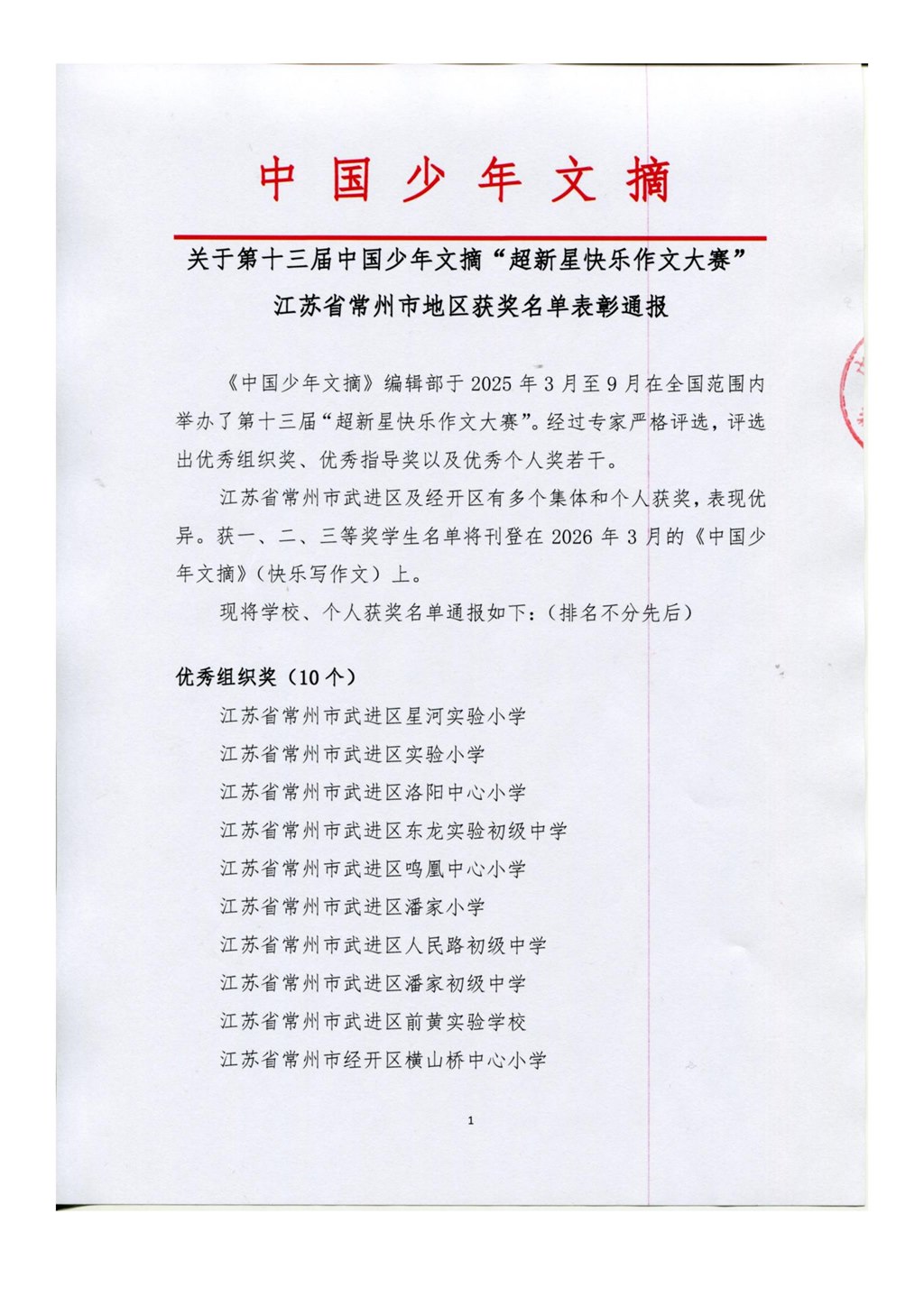 热烈祝贺我校学子在第十三届中国少年文摘“超新星快乐作文大赛”江苏省常州市地区中获优秀个人奖